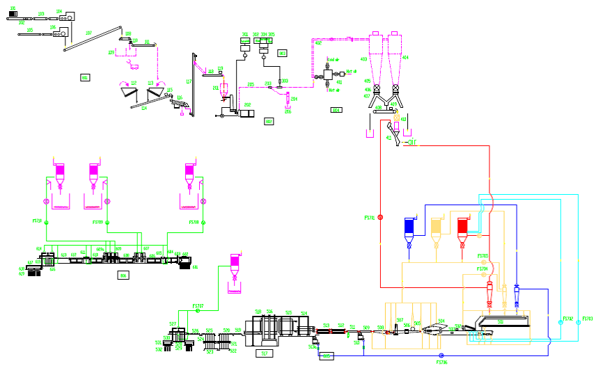 创新设计的电控系统为全电脑参数控制形式。采用现场通讯总线结构,可通过软件对生产过程的工艺参数和运行状态故障情况进行设定、操作、监控和记录;控制电脑冗余设计,在电脑上进行所有的生产操作,较以往简单电脑监控的方式在控制技术水平上以及可靠性上有了显著提升;大幅增加自动闭环调节回路,减少了人工干预,保证工艺过程运行稳定,波动小。B、 流程图参考