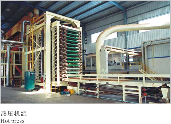 干燥过的纤维由风送系统送入真空机械铺装机,通过抛料辊及铺装头抛洒,均匀落在成型网带上,网带下的真空箱可调节负压使成型板坯密度更加均匀。蓬松的板坯经预压机预压密实后,经板坯纵、横截锯制成符合规格长度的板坯,然后经锯边运输机、加速皮带运输机、贮板运输机、伸缩式运输机等连续运输后送至装板机,装板机逐层装完板坯后,装板机内的小车将悬臂传送带连同板坯一道进入热压机,在送进过程中传送带前端的铲头将已压好的纤维板同时推出去,当小车到达终点时,纤维板已全部进入卸板机,而板坯也到达预定位置,此时小车后退,同时皮带向前运转,在传送带的线速度与小车后退速度相等时,板坯处于相对静止,从而被留在热压板上。板坯在热压机的温度和压力作用下,压制成规定的厚度,并使内部胶粘剂固化,从而制成具有一定强度的板材。压制后由卸板机将其成板卸至托架,在吊笼逐层下降时由出板机构逐块卸出,运至下一工序。热压后的毛板经过冷却翻板机自然冷却后由纵横锯边机、横向锯边机锯边后堆垛。